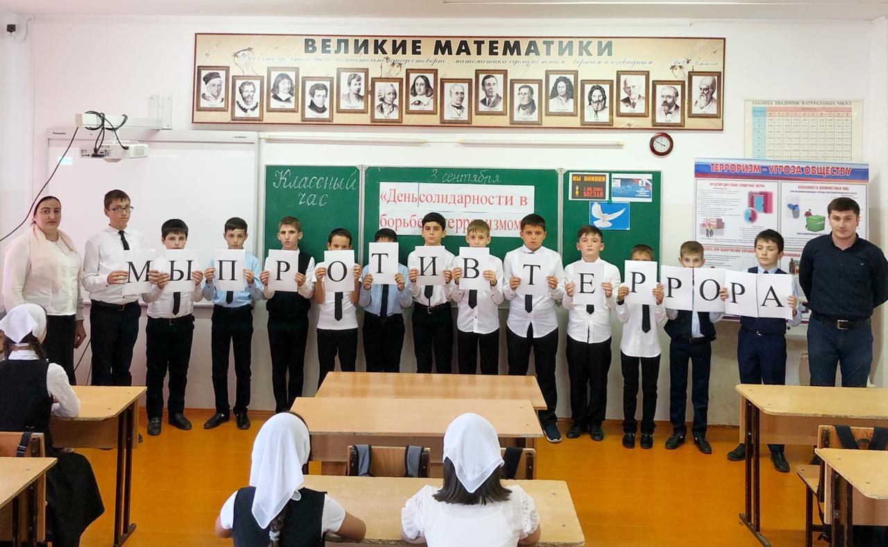 03.09.2019Согласно плану РУО от 31 июля 2019г о проведении мероприятий, приуроченных ко Дню солидарности борьбы с терроризмом (3сентября) с целью формирования у учащихся толерантности, неприятия идей ксенофобии классный руководитель 6а класса Дикеева А.М. совместно с зам.дир.по ОБЖ Абдулазиевым Х.А. провели классный час на тему: "День солидарности в борьбе с терроризмом".